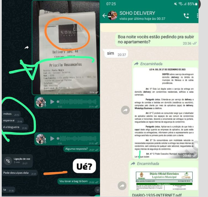 Manaus/AM – Um entregador de aplicativo foi desligado do restaurante Soho Lounge, localizado no bairro do São Jorge após a blogueira Priscila Vasconcelos ter se recusado a receber a entrega da comida na portaria do prédio em que mora, no condomínio Life Ponta Negra, zona oeste de Manaus.