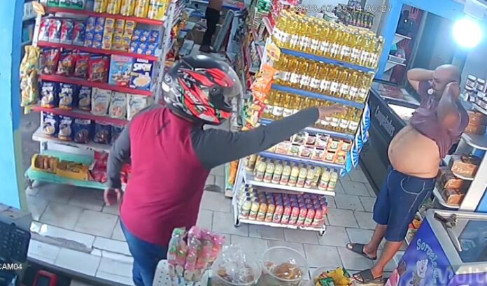 Segundo informações, o suspeito chegou em uma motocicleta de placa QZF8E39 e entrou no estabelecimento de capacete, para não ser reconhecido. Na sequência, ele anuncia o assalto e rouba toda a renda do caixa. Confira:
