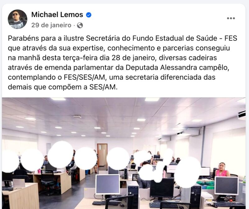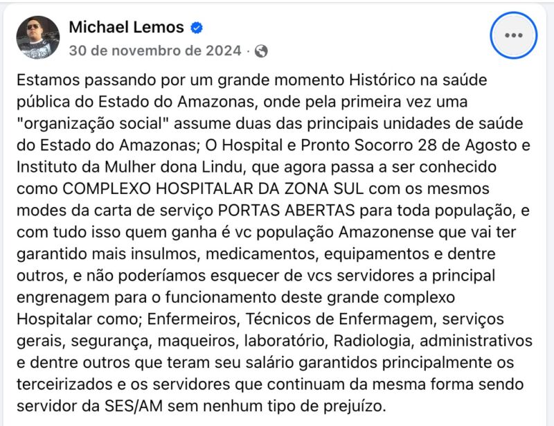 Antes da saída, o servidor usava suas redes sociais para enaltecer o modelo de terceirização por Organizações Sociais de Saúde (OSS), defendendo a atuação delas em unidades estratégicas como o Hospital 28 de Agosto, o Instituto da Mulher Dona Lindu e o Hospital Delphina Aziz.