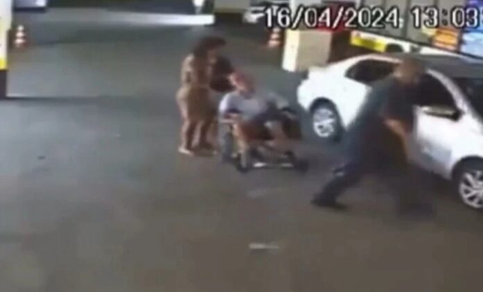 Em seguida, Paulo Roberto é colocado em uma cadeira de rodas que a mulher pegou no estabelecimento. Segundo o motorista, o idoso e a mulher foram deixados no shopping porque o acesso de veículos é proibido na agência bancária.