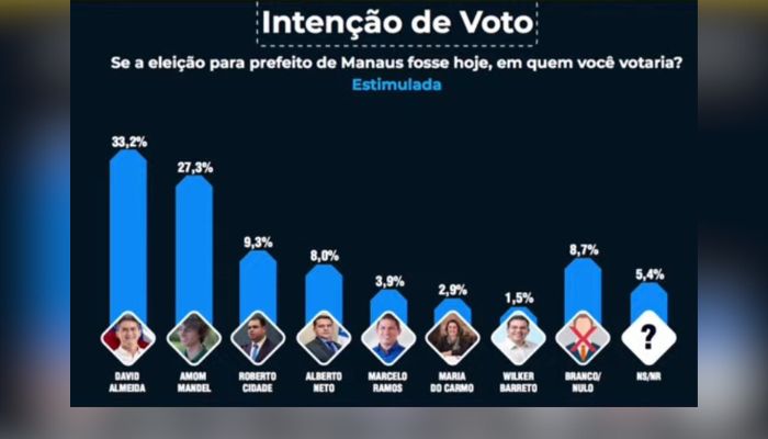 Conforme a pesquisa, David Almeida é o preferido pela maioria dos entrevistados com 33,2%. Na sequência está Amom Mandel com 27,3%, Roberto Cidade com 9,3%, Alberto Neto com 8%, Marcelo Ramos com 3,9%, Maria do Carmo 2,9% e Wilker Barreto com 1,5%. Brancos e nulos somam 8,7%. Não sabe ou não respondeu 5,4%. A margem de erro é de 3,2%.