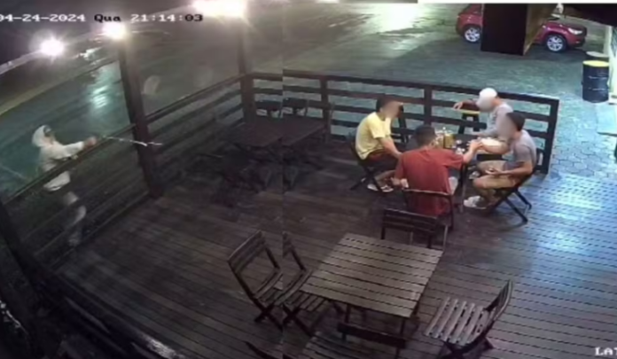 Imagens de câmeras de segurança registraram o momento em que um homem foi executado em um ataque a tiros dentro de uma estabelecimento comercial quando estava sentado com um grupo de amigos.