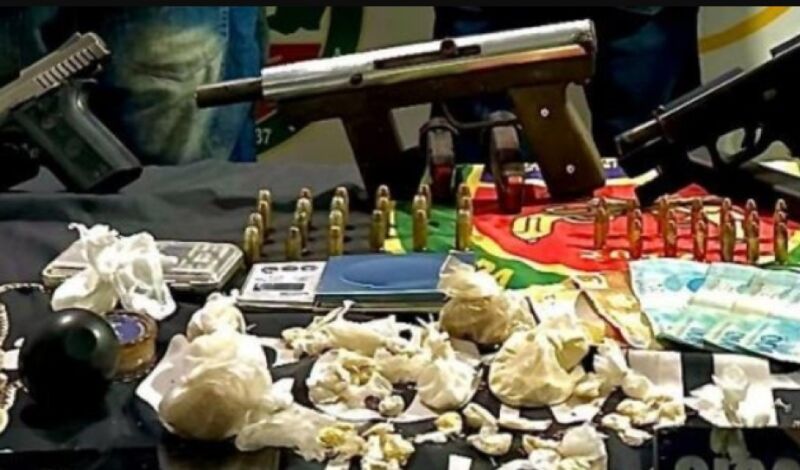 Durante a perseguição o trio acabou sendo alcançado e preso. Foram apreendidos o carro, uma submetralhadora, uma glock 9 mm, com laser, uma pistola .380, várias munições, porções de drogas, balança de precisão, celulares e um colete balístico.