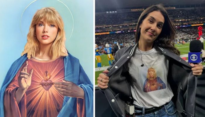 A jornalista Mariana Spinelli, do Globo Esporte, foi criticada após aparecer em uma postagem usando uma camiseta com a imagem de Nossa Senhora, mas com o rosto da cantora Taylor Swift. O episódio ocorreu durante a abertura da NFL no Brasil, em São Paulo.
