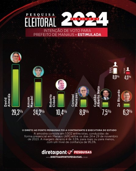 No primeiro cenário, ele alcançou 10,4% das intenções de votos. Em primeiro e segundo lugares ficaram o atual prefeito David Almeida (Avante – 29,3%) e o deputado federal Amom Mandel (Cidadania – 24,2%), respectivamente. Depois de Cidade, estão Coronel Menezes (8,9%), Alberto Neto (7,5%) e Zé Ricardo (PT – 6,3%). Brancos e nulos somaram 8,9% e não souberam opinar, 4,5%.