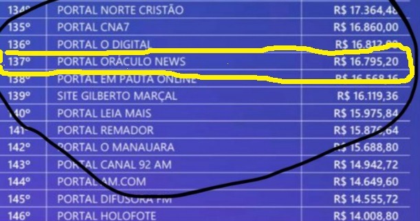 O Influenciador Will Robson, figura entre os beneficiados através do Portal Oráculo News, de propriedade do seu irmão. Ainda segundo dados, o influencer recebe mais de R$ 16 mil da Prefeitura de Manaus. Confira:
