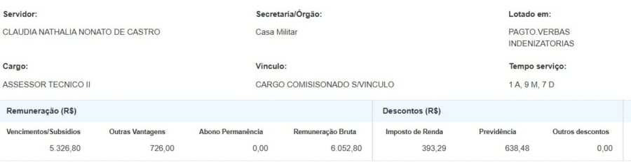 A influenciadora Claudia Nathalia também recebe mais de R$ 5 mil e está lotada na Casa Militar conforme os dados no portal da transparência.