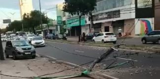 Poste cai e motoristas usam desvio por calçada para trafegar em...
