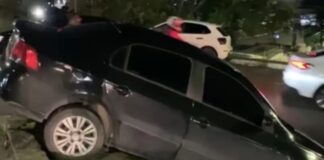 Veículo fica pendurado em calçada após condutor entrar em rua sem...