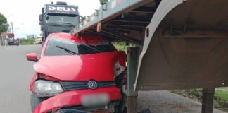 Veículo fica destruído após parar debaixo de carreta parada em local...