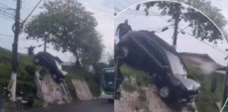Prestes a cair durante acidente, carro fica pendurado em barranco na...