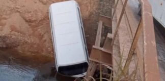 Veículo utilitário cai dentro de rio durante travessia de ponte de...