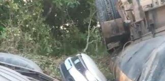 Carreta tomba em cima de um carro na estrada do Puraquequara