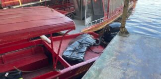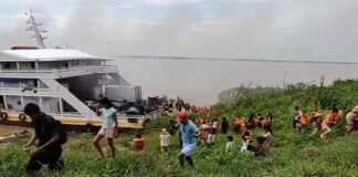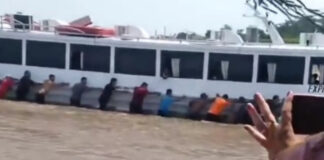 Lancha encalha no meio do rio e passageiros precisam empurrar embarcação;...