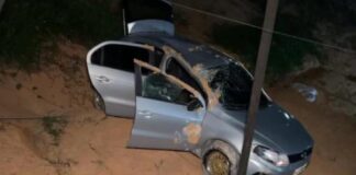 Veículo dirigido por suspeitos de assalto capota durante perseguição policial em...