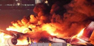 Avião da Japan Airlines pegando fogo em Aeroporto de Haneda, em...