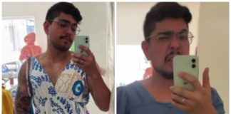 Jovem veste roupas femininas para ajudar a divulgar loja da esposa...