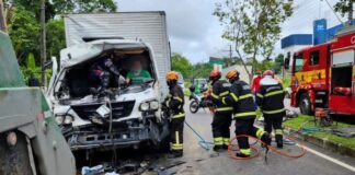 Corpo de Bombeiros resgata duas vítimas presas nas ferragens de caminhão...