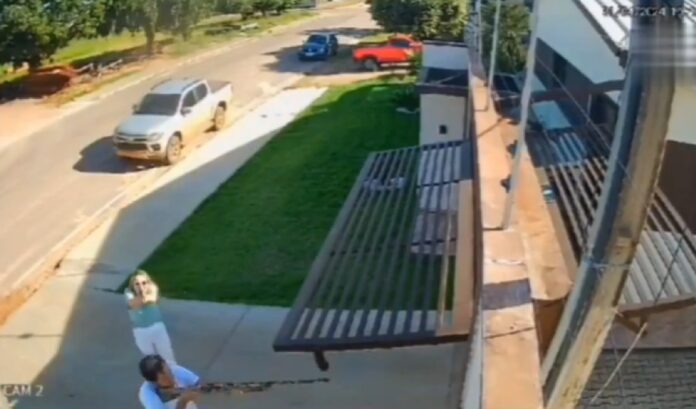 Assim que a mulher sai do imóvel, ela aponta para a câmera de segurança que registrou as imagens, aponta e ri. O filho dela aponta uma espingarda para o equipamento e faz um disparo. Confira: